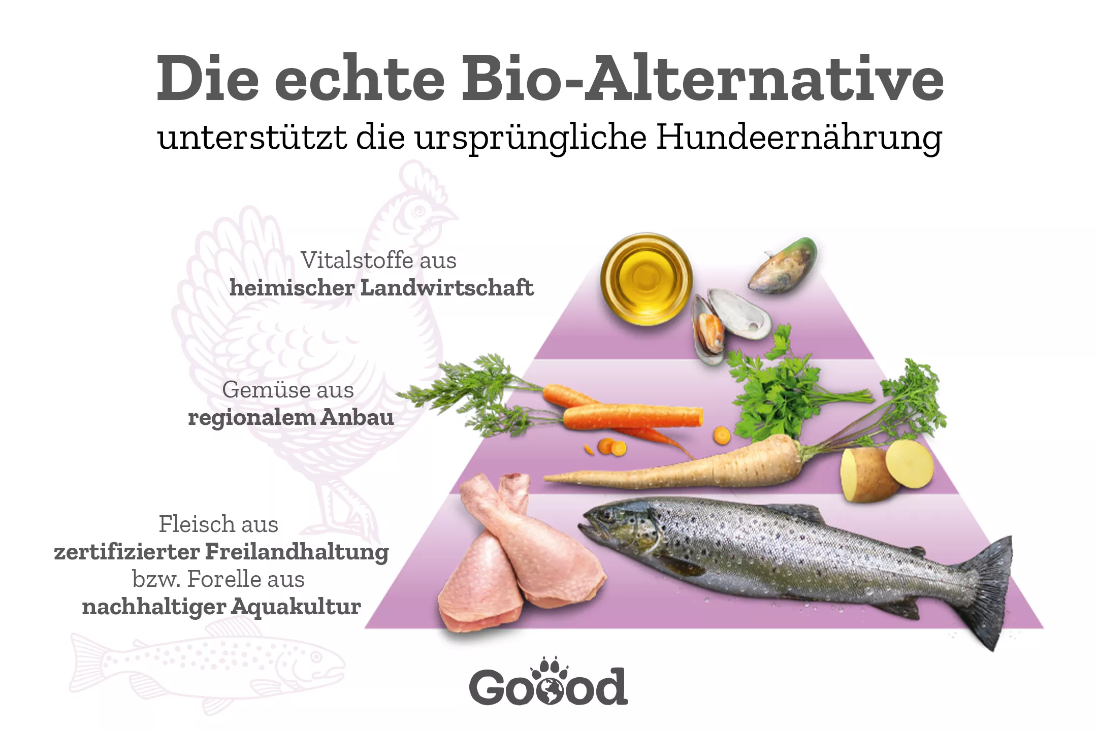 Glückliche Freilandputen, die nur natürliches Futter bekommen, liefern das fettarme Putenfleisch für unser Goood Hundefutter. Hinzu kommen artgerecht gezüchtete Forellen sowie regionales Gemüse. Die leicht bekömmliche Rezeptur ist an die Ansprüche von kleinen Hundesenioren angepasst. Sie braucht keinen Zuckerzusatz oder künstliche Farb-, Aroma- und Konservierungsstoffe. Stattdessen verwenden wir Grünlippmuschel und Vitamine, die gut für die Gelenke und das Immunsystem sind. Du kannst unser Nassfutter mit Trockenfutter mischen oder allein füttern. So bekommt dein Liebling alles, was er für einen vitalen Lebensabend braucht.